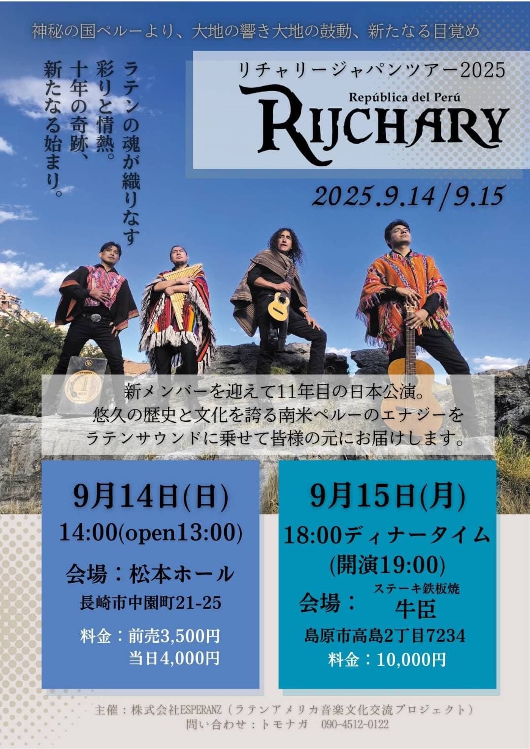2025/04/16 | 【リチャリー・ジャパンツアー2025】スケジュール変更更新しました ◦佐賀・多久[国際支援チャリティコンサート]:10/13(月/祝)に日程変更 |